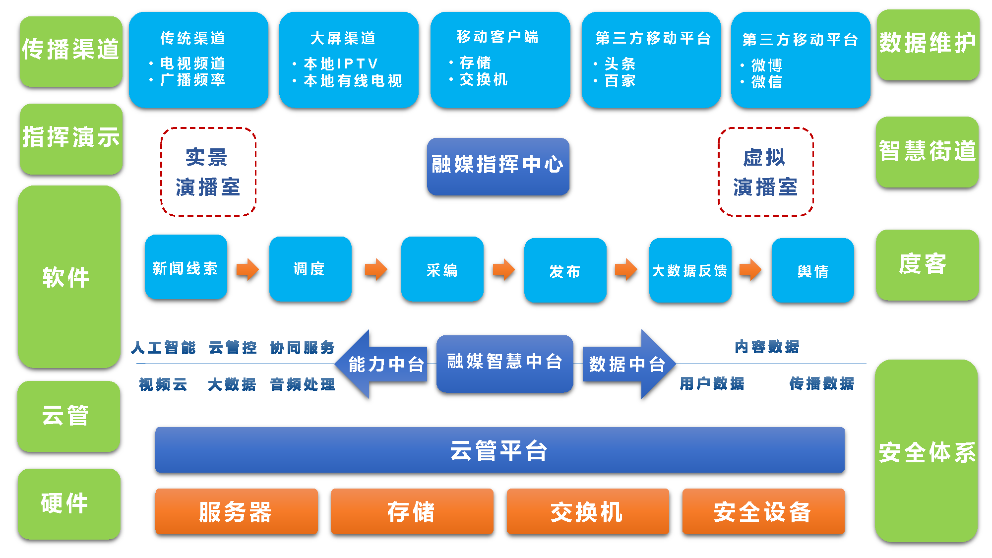 我司关于区县融媒体中心建设的设计将着力提升互联网环境下新闻内容创新能力、科学管理能力和报道传播能力,在综合服务平台,可实现生产业务与资源、策划、加工、渠道、终端、受众等方面的深度融合,可实现采编专业化、管理智能化、数据可视化,可实现新闻信息采集、编辑、发布、供稿、管理、反馈等各环节以及新闻舆情、传播渠道、影响力的统一管控,并为融合生产组织指挥策划、运行监测及融合报道考核体系提供集约化、智能化服务,构建新型传媒“重服务、轻资产”的“互联网+”驱动模式。